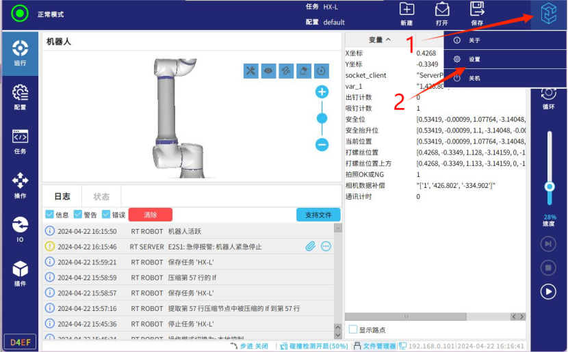 第二步-在机器人示教器上点击右上角菜单——点击设置