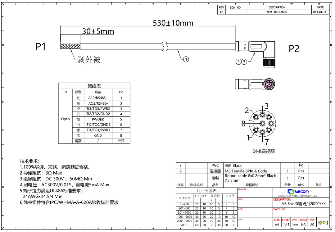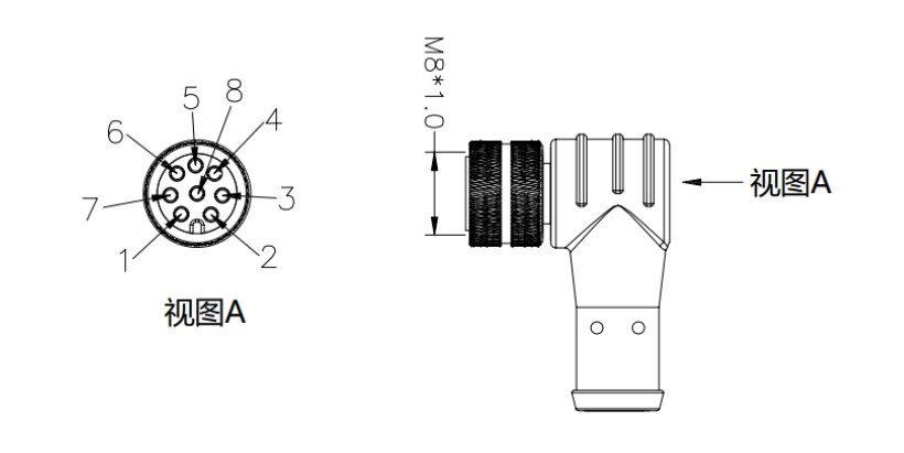 如果是用艾利特提供的8芯弯头成型线,【物料号NA20300180】如图;则针脚编号、线序颜色为固定排序。