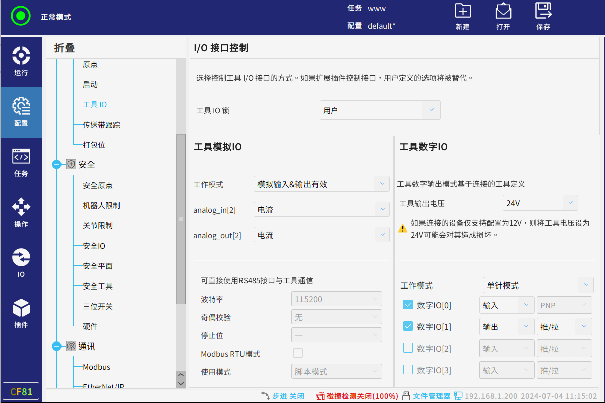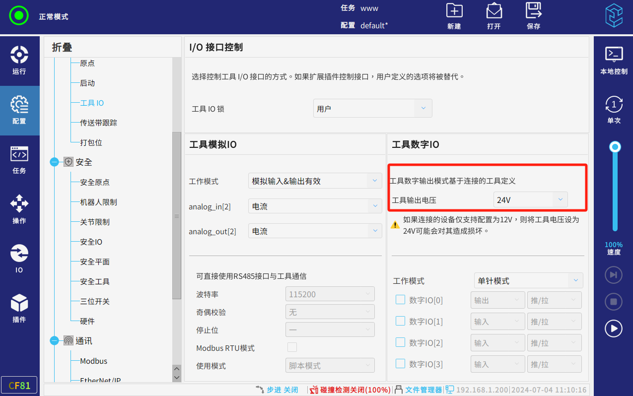 数字IO输出可在工具IO配置PNP或NPN模式