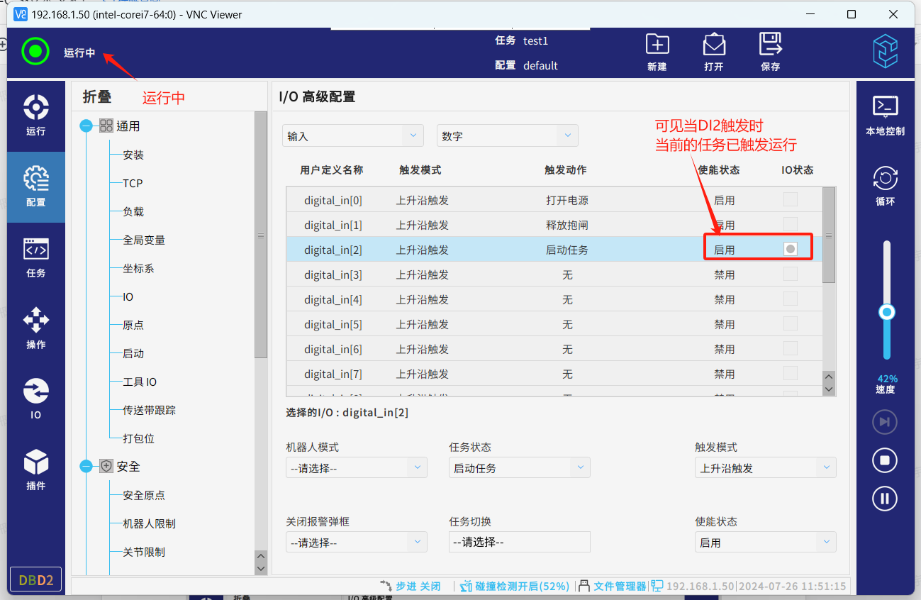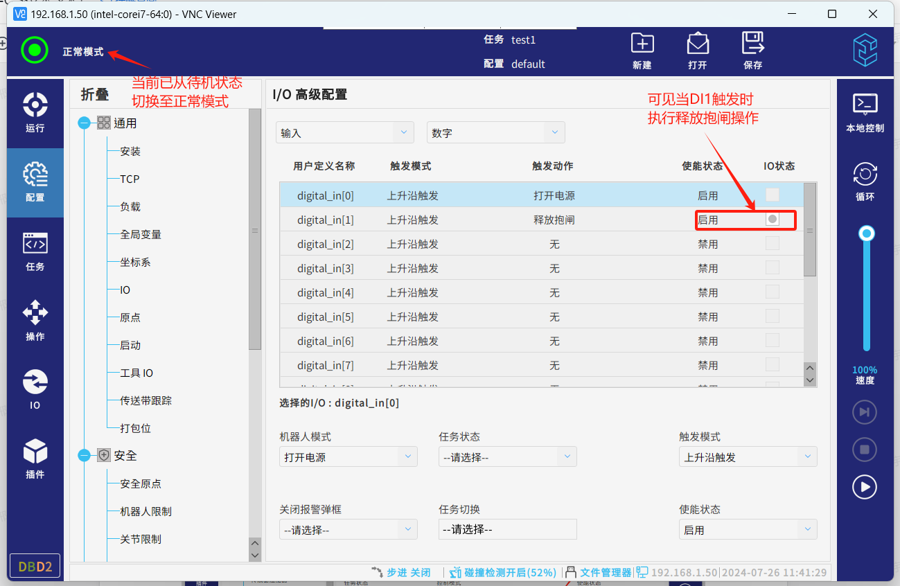 ● 对应的DI1已触发,机器人从待机状态切换至正常状态。
