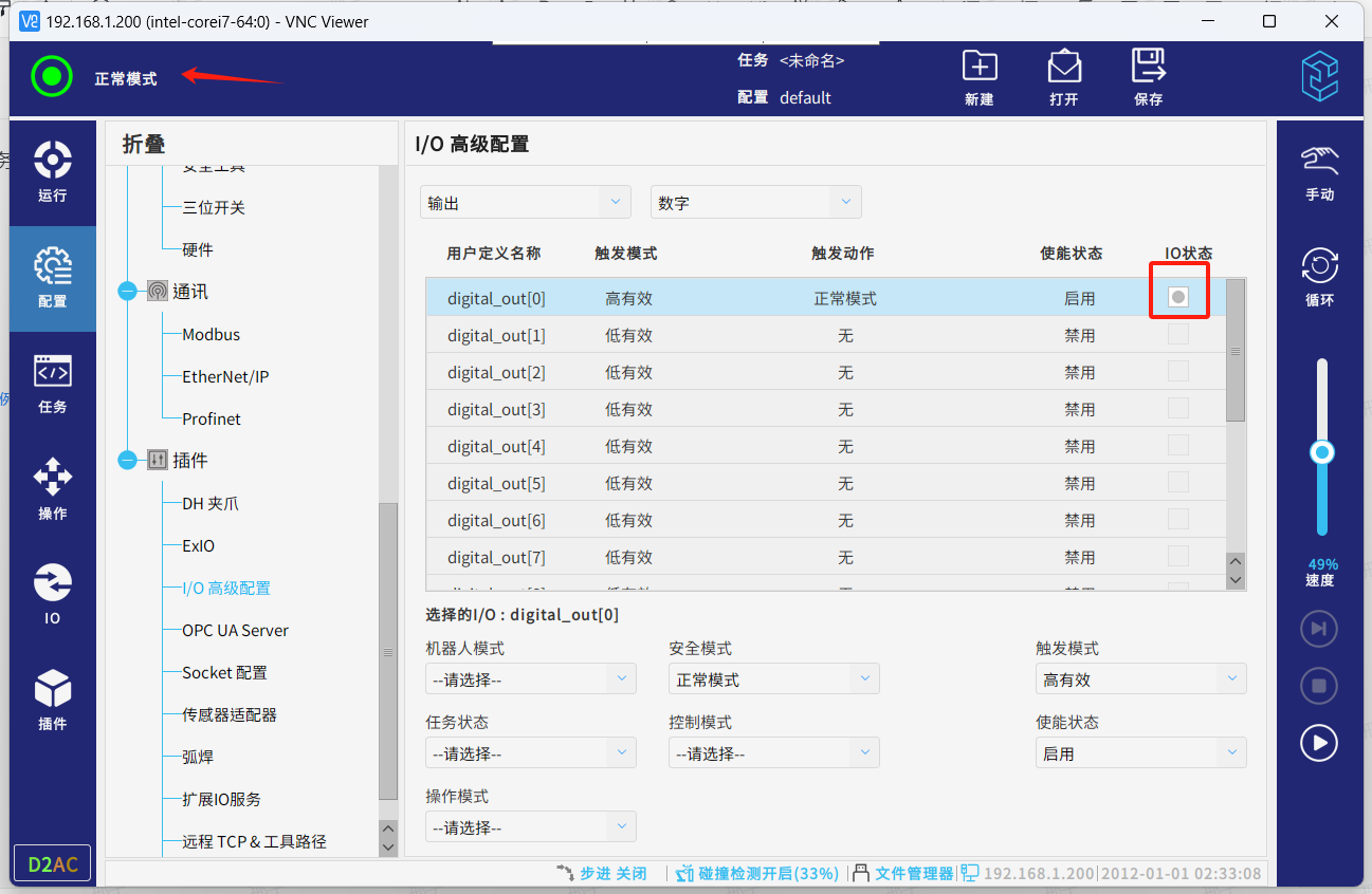 ● 设置完成后可发现机器人处于正常模式时,对应的DO0已触发。