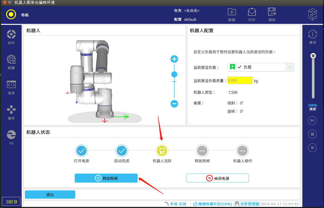 2.1.3等待机器人活跃变为黄色时,点击左下角箭头所示的释放抱闸按钮
