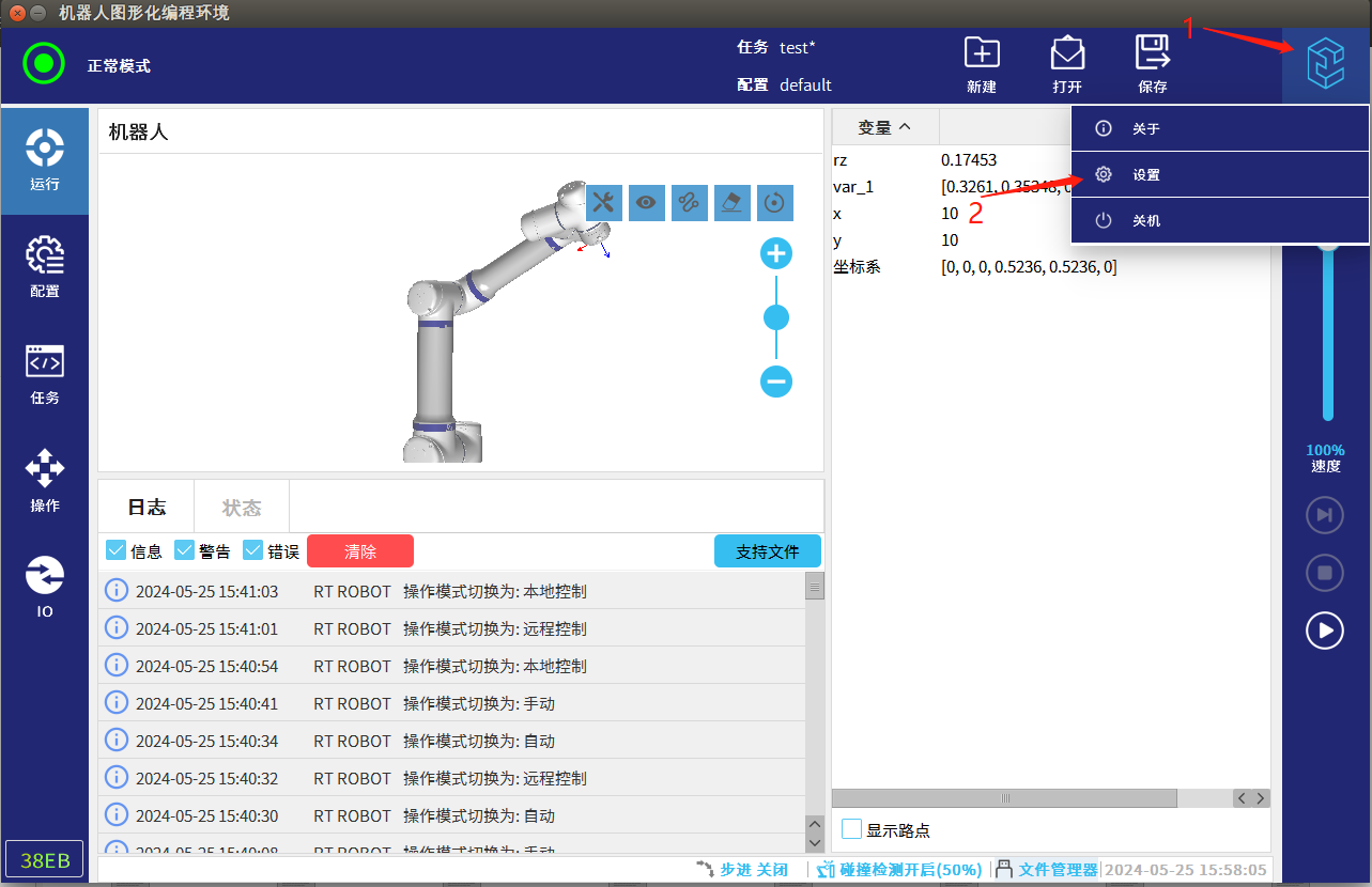 手动模式即机器人需要用示教器来控制机器人的移动,一般用于调试阶段,进行点位示教以及流程验证