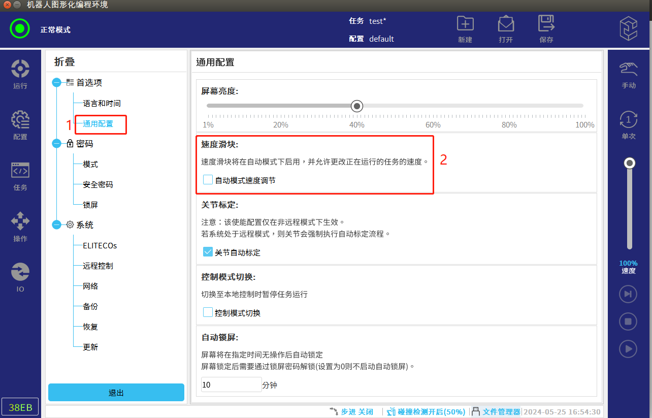 如果需要在自动模式下修改速度,则需要在设置模式的界面中选择通用配置,勾选自动模式速度调节,此时再切换成自动模式时,右边的速度滑块就可以进行速度调节