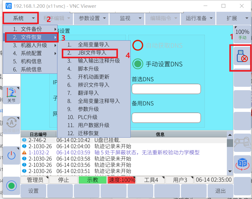 将对应机型打包程序文件放置u盘rbctrl文件夹里,U盘插到控制柜USB接口确认U盘识别成功如图标签1,示教器界面打包程序导入如2.34步骤操作如下