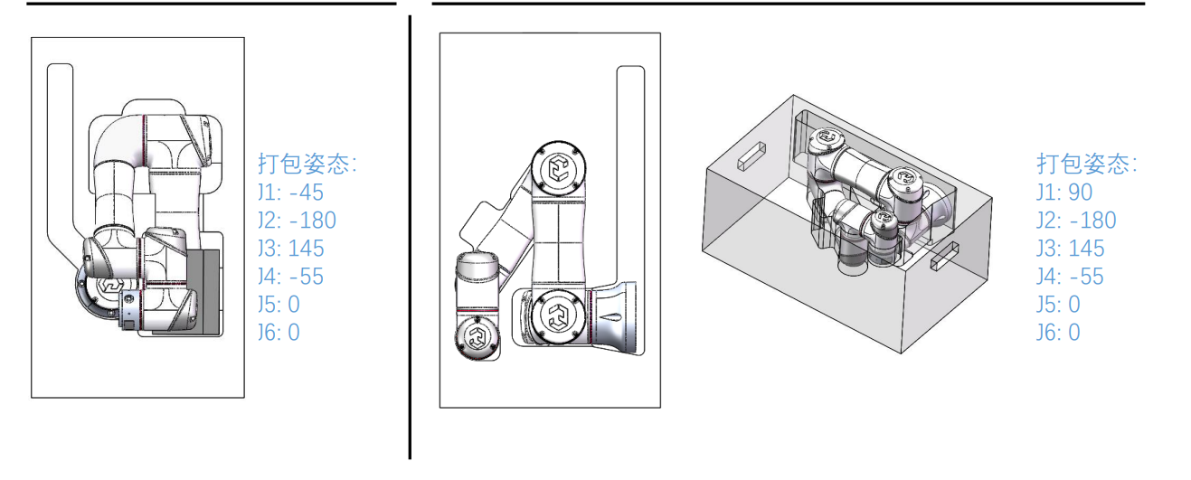 打包姿态角度:J1: -45 J2: -180 J3: 145 J4: -55 J5: 0 J6: 0