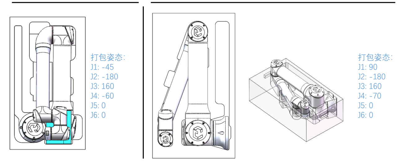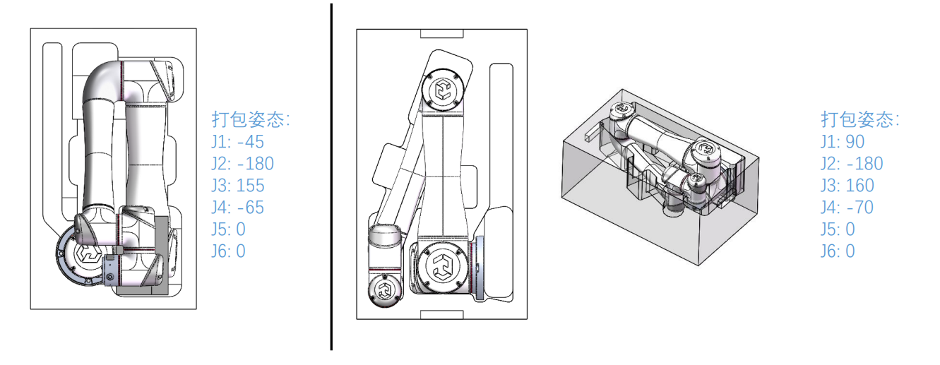打包姿态角度:J1: -45 J2: -180 J3: 160 J4: -60 J5: 0 J6: 0
